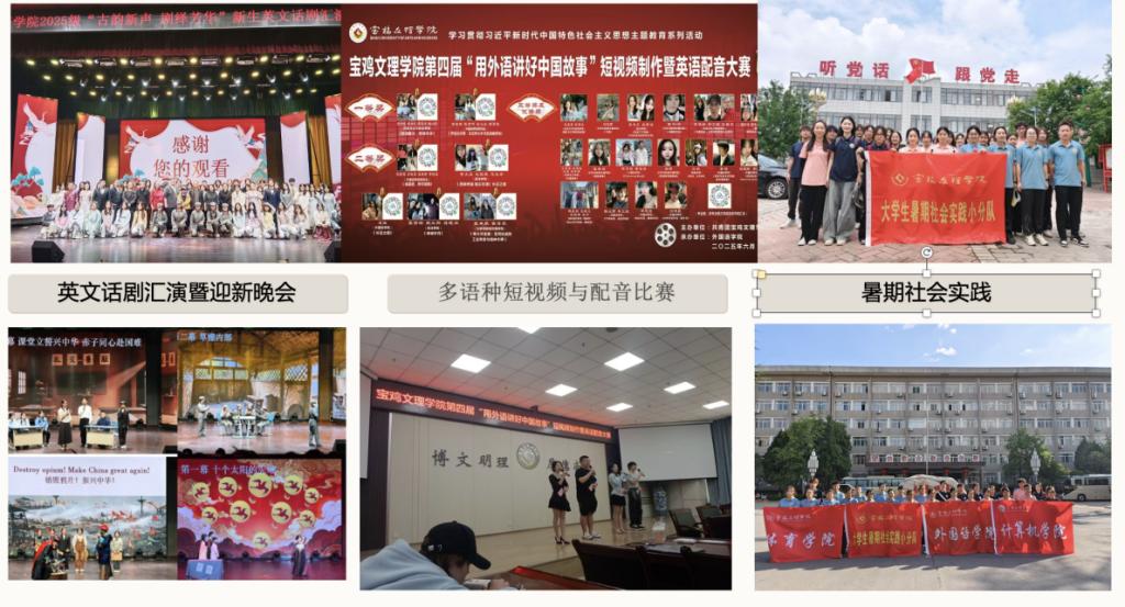 围绕“一院一品”建设,学院组织开展主题教育活动,引导学生在专业学习中坚定理想信念,持续打造多语种文化与实践育人品牌,组织开展英文话剧汇演、语言文化展示等活动,推动外语专业优势与地方文化传播相结合。暑期社会实践团队深入基层,将语言服务融入乡村振兴与文旅发展。学生志愿者积极服务大型赛事与校内外活动,在真实场景中提升专业素养与责任意识。