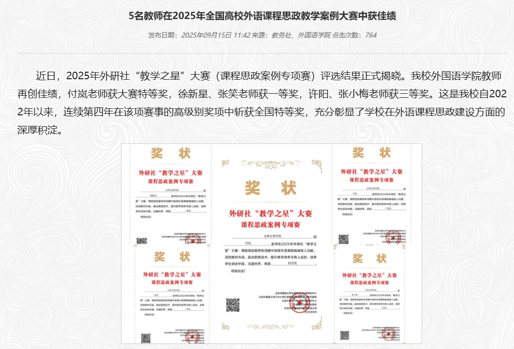 同时,学院不断创新“外语与思政融合”育人模式,通过专题学习、研讨交流等形式,引导学生用外语讲好中国故事。全年学生在各级各类竞赛中屡获佳绩,学风建设与实践育人成效持续显现,学生综合素质和社会责任感不断提升。