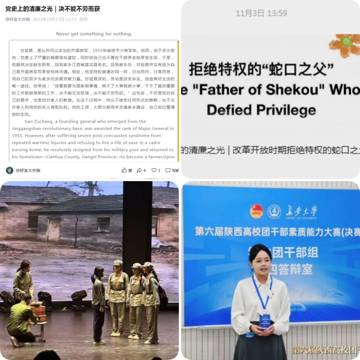 2025 年,外国语学院以党建为引领,深耕思想政治教育阵地,扎实开展党的二十届四中全会精神、中央八项规定精神专题学习,通过专题班研学、宣讲会精学、“三会一课”常学、主题党日活动践学等形式推动理论学习入脑入心,同步深化师德师风建设,厚植中华优秀传统文化、革命文化、社会主义先进文化育人底蕴,引导师生筑牢思想根基。党建实践持续深化,专业英语教工党支部“双带头人”教师党支部书记“强国行”专项行动稳步推进,以“党建领航产学研,科技赋能强国行”为导向,在党建联建、教育服务等方面成果丰硕;学生第二党支部争先进位为“Ⅰ类”样板支部,支部战斗堡垒作用进一步凸显;学院顺利完成5个党支部换届选举,选优配强支部委员,为党建工作注入新活力;挖掘身边党员的先进事迹,树立可学可及的榜样,评选“我身边的旗帜党员”5人,营造全院形成“向先进看齐”的良好氛围,有效激发党员群体的责任意识,学生党员在第六届陕西高校团干部素质能力大赛决赛中荣获学生团干部组二等奖。廉洁文化建设亮点纷呈,学院打造“双语廉韵坊”特色品牌,圆满完成开设“党史上的清廉故事”线上专栏和排演英文廉洁话剧等 “六个一” 建设项目,将廉洁教育与外语专业特色深度融合,营造崇廉拒腐的良好风尚。党建引领下的思想建设、组织建设与廉洁建设协同发力、一体推进,为学院高质量发展提供坚强政治保障。