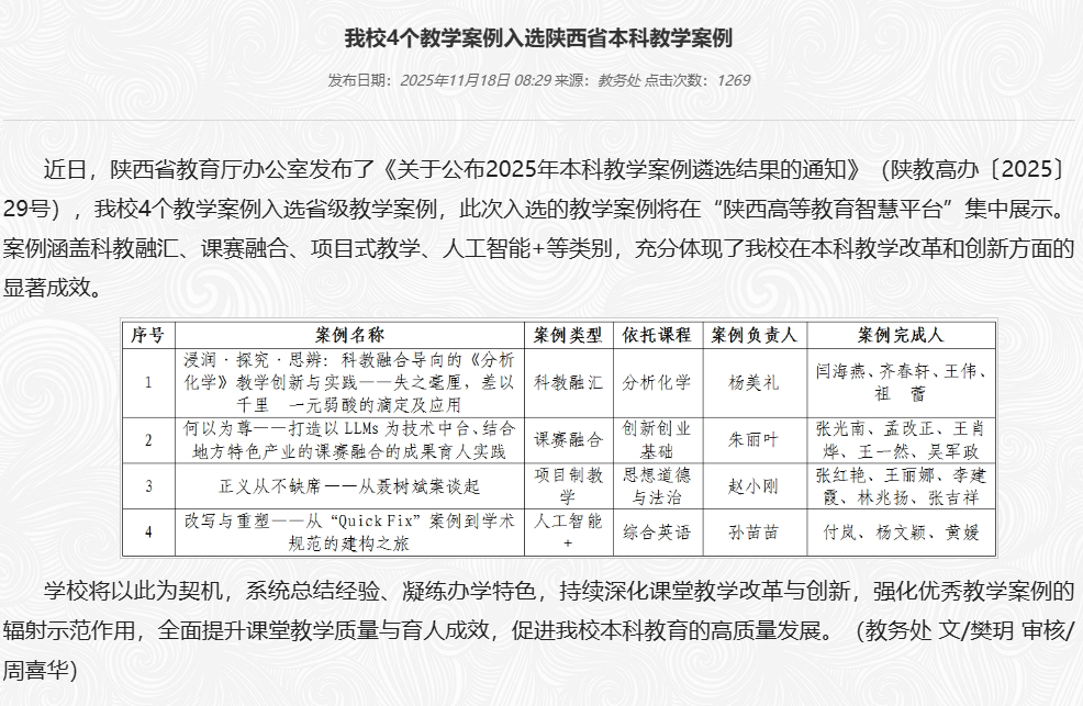 2025年,外国语学院坚持以内涵式发展为主线,统筹推进英语专业、翻译专业以及微专业建设,本科专业建设与教学改革取得显著成效。英语专业有序推进国家师范专业二级认证专家进校考察及后续整改工作,培养体系日趋完善;翻译专业持续优化课程结构与实践教学环节,专业特色得到进一步凝练;“跨境电商多语种应用”微专业成功开设,探索出“外语+技术+商务”复合型人才培养的新路径。在教学改革领域,学院以OBE理念与数智技术赋能课堂教学,教学成果丰硕。教师团队荣获多项教学成果,教改项目成功立项并持续推进。冯琳副教授主持的《高级英语》课程团队获批陕西省第三批课程思政示范精品课程及教学团队;孙苗苗老师团队案例《改写与重塑——从“Quick Fix”案例到学术规范的建构之旅》入选省级教学案例;王宇珍博士团队成果“大思政引领下英语师范专业三维五链协同育人模式构建与实践”获批校级教学成果奖二等奖,教学示范与引领作用显著。学院积极推动产教融合,李伟教授团队与行业合作共建“陕西文旅多语国际传播智能实验教学中心”,开发《旅游翻译》等实验课程,显著提升了实践育人成效。年内,教师在各级教学竞赛中屡获殊荣,标志着学院本科教学质量与育人水平实现了整体性跃升。