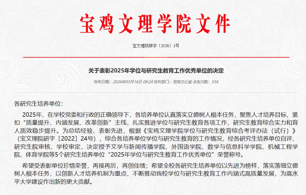 近日,学校发布《关于表彰2025年学位与研究生教育工作优秀单位的决定》,我院凭借在研究生培养、质量提升、内涵建设与改革创新等方面的突出成效,被授予2025年学位与研究生教育工作优秀单位荣誉称号。