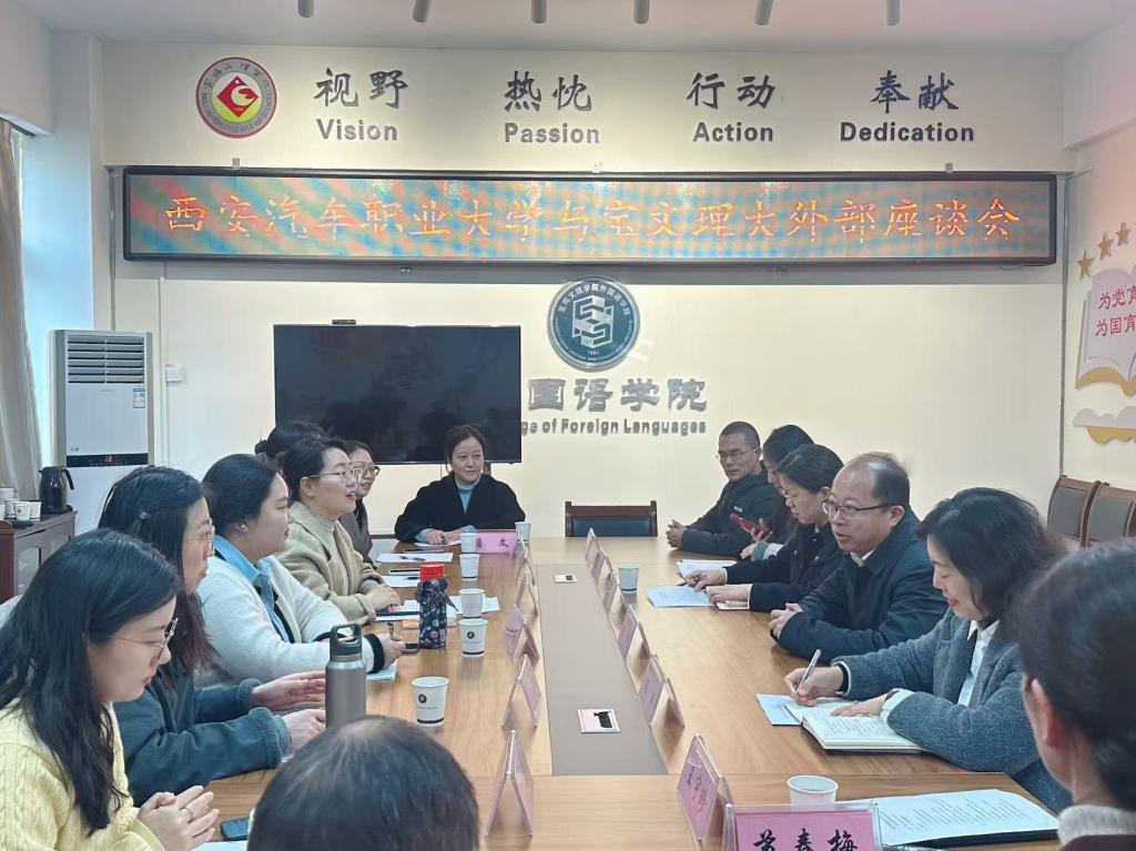 为推动高校外语教学改革与实验室建设的经验共享,12月5日,西安汽车职业大学文理学院外语学院副院长靳艳、外语教研室主任牛璐芳一行七人来我校开展专题调研。外国语学院院长李伟、副院长冯琳、英语系主任王宇珍、大学外语教学部主任张雨和部分教师代表参加了座谈。