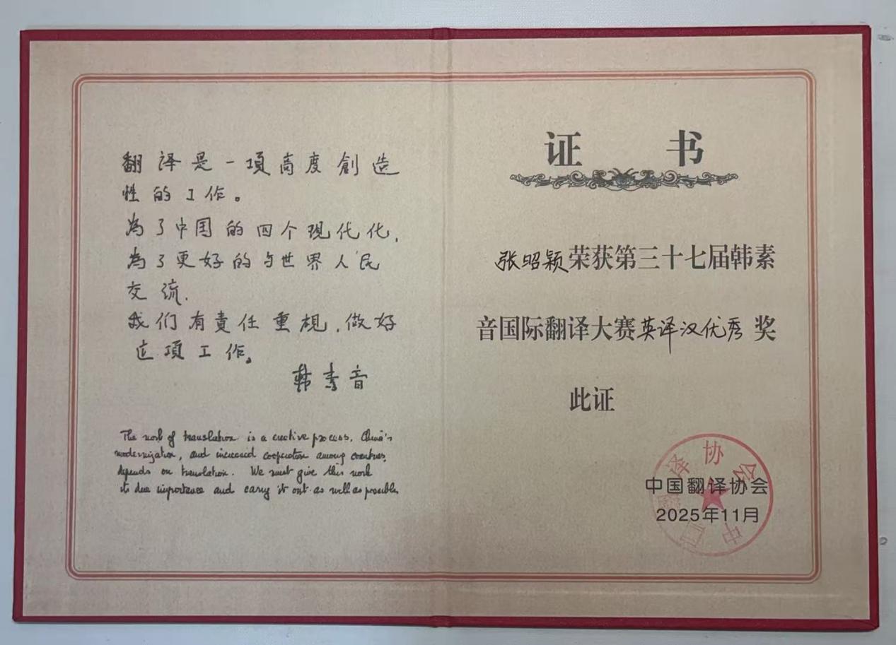 我院研究生张昭颖在第三十七届韩素音国际翻译大赛中荣获优秀奖